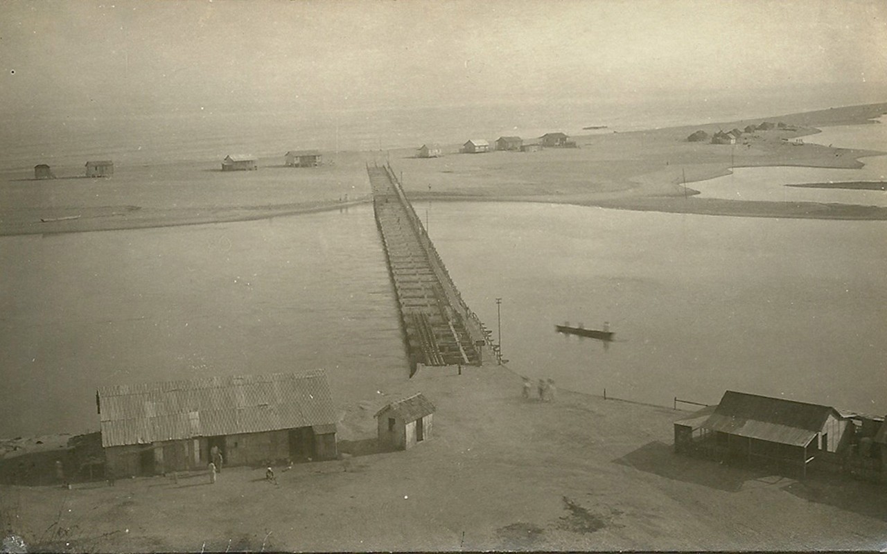 Ponte de ligação à Ilha do Cabo, postal do início do Século XX (c. 1910). Fonte desconhecida.