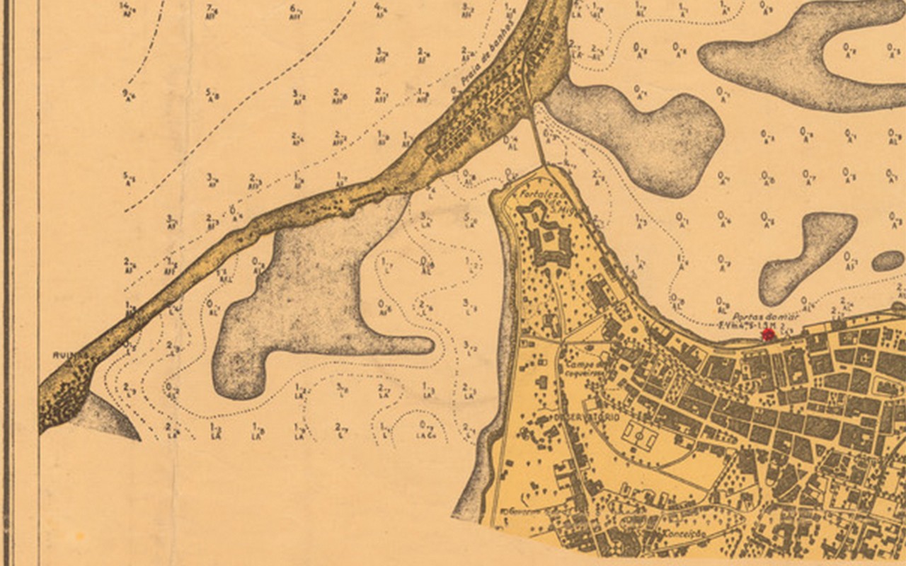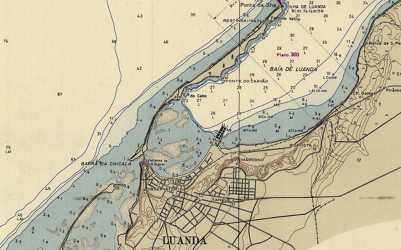 By the half of the 20th Century, the kalembas had made entire portions of sand in the Southern side of the island disappear. The Chicala area had become isolated from the island (its configuration gave origin to the name Felete [fillet]). [Carta Hidrográfica do Porto de Luanda à Ponta das Palmeirinhas, 1ª ed., Lisboa, 1964. Arquivo IICT]
